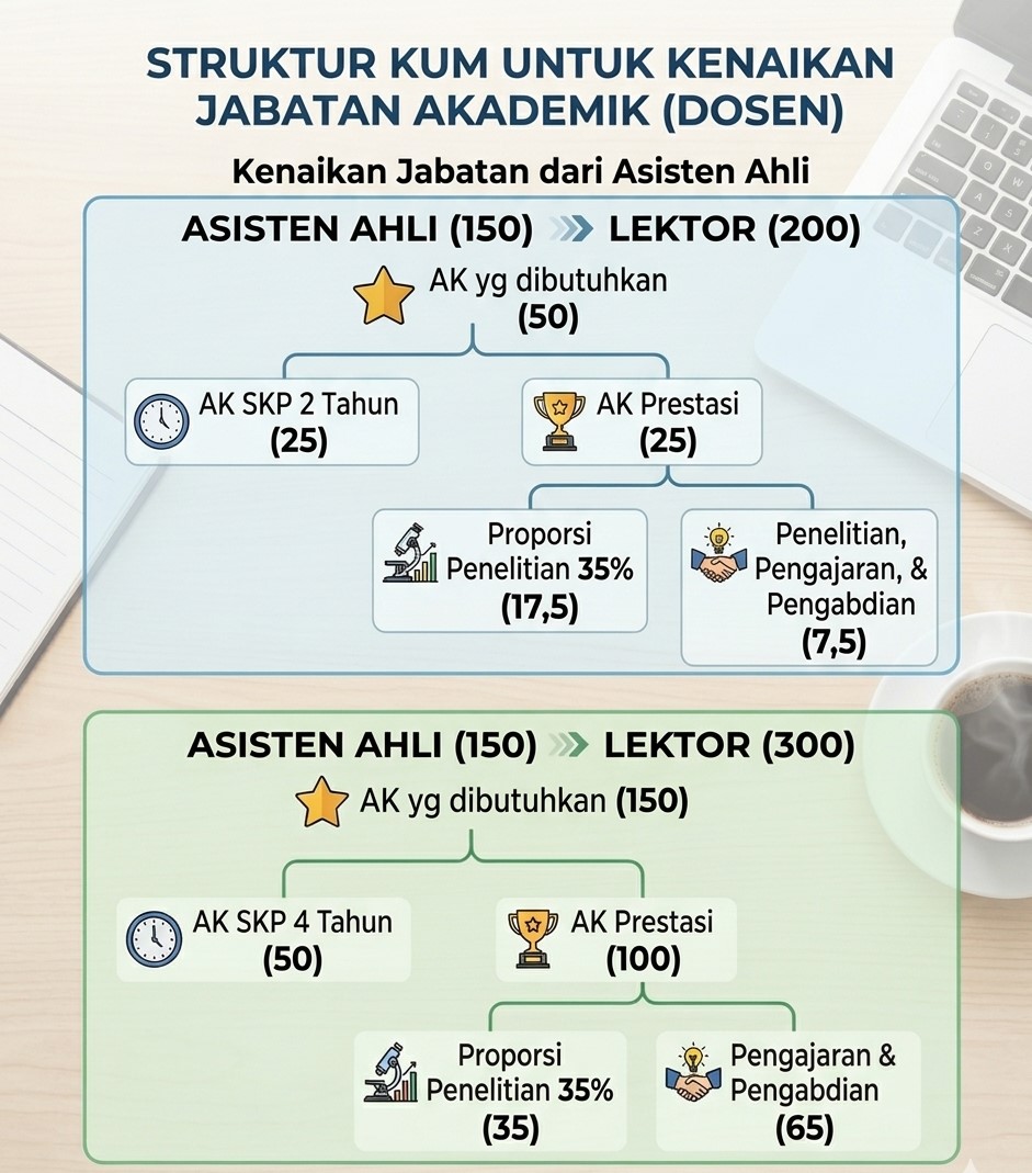 - Asisten Ahli (150) ke Lektor (200): AK yang dibutuhkan 50 [butuh minimal 2 tahun]
