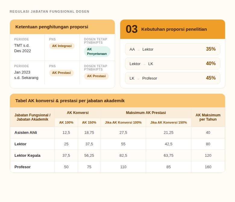 - Proporsi Penelitian tiap jenjang: Asisten Ahli (35%), Lektor dan Lektor Kepala (40%), dan Guru Besar (45%)